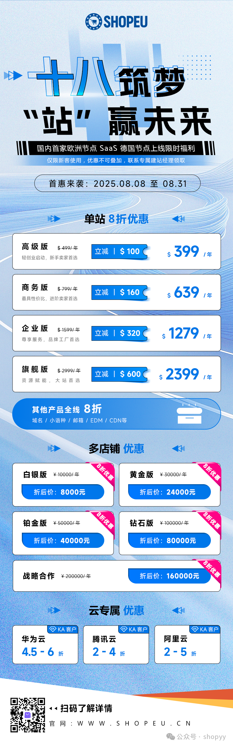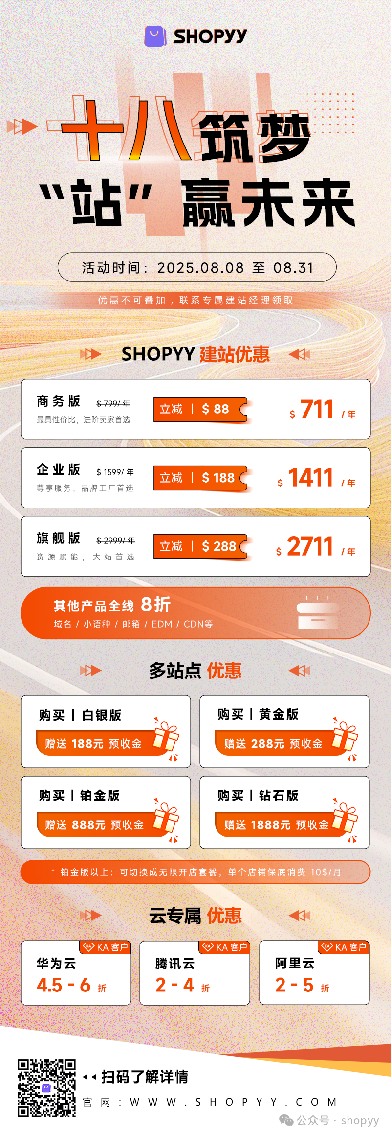 值此廈門中恒天下成立十八周年之際,為表達對廣大用戶長久以來大力支持與厚愛的誠摯感謝,SHOPYY于[2025.8.8 - 8.31]盛大開啟優(yōu)惠活動: